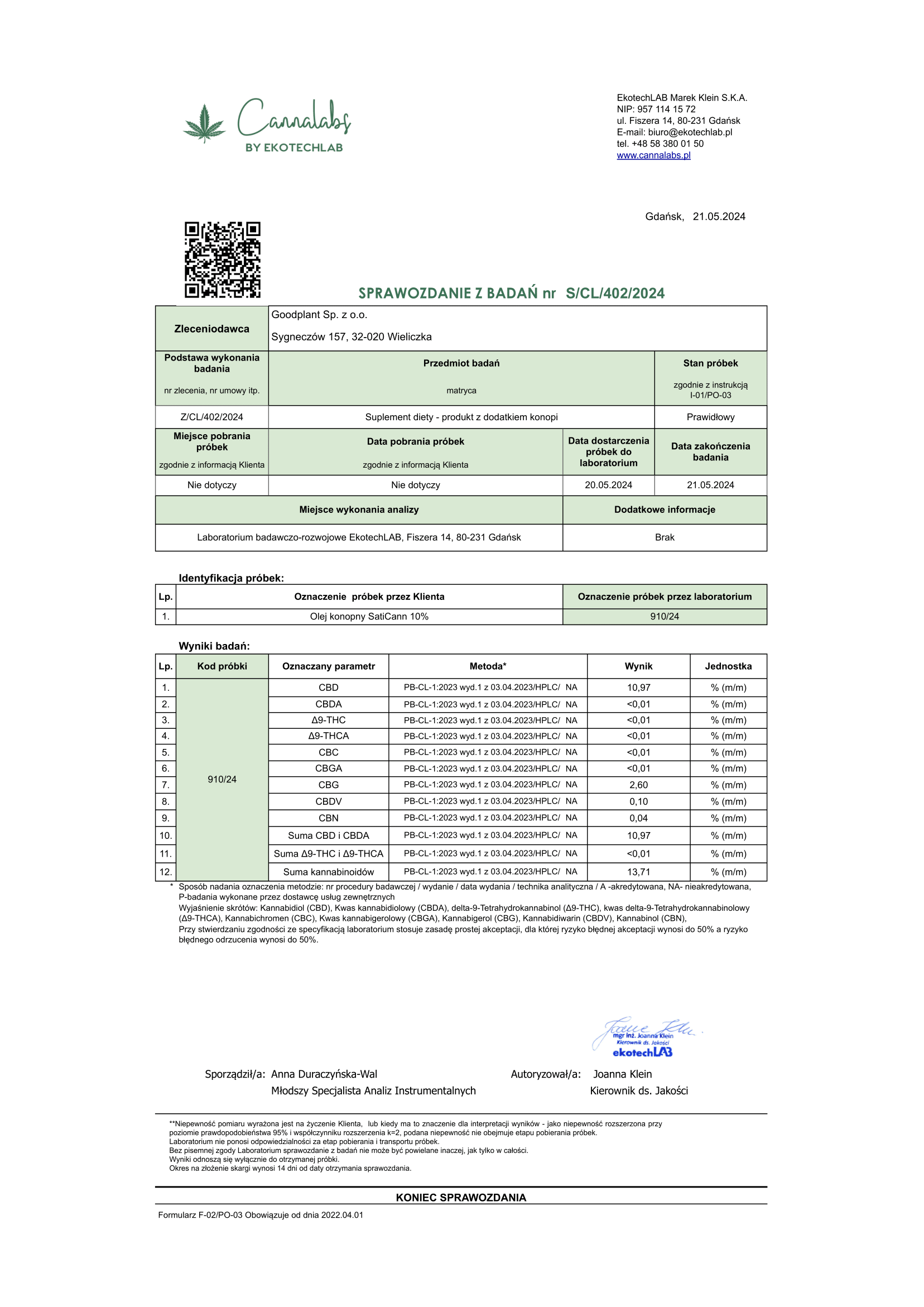 Finalny produkt jest badany pod kątem gwarancji stężenia (certyfikat dostępny obok zdjęcia produktu), a jeszcze przed rozpoczęciem produkcji badamy składniki pod kątem czystości od pestycydów, metali ciężkich i innych zanieczyszczeń.